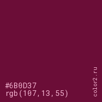 Цвет #6B0D37 в цветовой модели RGB обозначается тремя октетами (107, 13, 55) в десятичном формате и #6B0D37 в шестнадцатиричном (hex) формате, которые являются интенсивностью красного 107 (hex 6B), интенсивность зелёного 13 (hex 0D) и интенсивность синего 55 (hex 37).