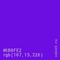 Цвет #6B0FE2 в цветовой модели RGB обозначается тремя октетами (107, 15, 226) в десятичном формате и #6B0FE2 в шестнадцатиричном (hex) формате, которые являются интенсивностью красного 107 (hex 6B), интенсивность зелёного 15 (hex 0F) и интенсивность синего 226 (hex E2).