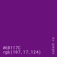Цвет #6B117C в цветовой модели RGB обозначается тремя октетами (107, 17, 124) в десятичном формате и #6B117C в шестнадцатиричном (hex) формате, которые являются интенсивностью красного 107 (hex 6B), интенсивность зелёного 17 (hex 11) и интенсивность синего 124 (hex 7C).