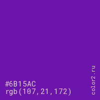 Цвет #6B15AC в цветовой модели RGB обозначается тремя октетами (107, 21, 172) в десятичном формате и #6B15AC в шестнадцатиричном (hex) формате, которые являются интенсивностью красного 107 (hex 6B), интенсивность зелёного 21 (hex 15) и интенсивность синего 172 (hex AC).