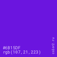 Цвет #6B15DF в цветовой модели RGB обозначается тремя октетами (107, 21, 223) в десятичном формате и #6B15DF в шестнадцатиричном (hex) формате, которые являются интенсивностью красного 107 (hex 6B), интенсивность зелёного 21 (hex 15) и интенсивность синего 223 (hex DF).