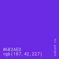 Цвет #6B2AE3 в цветовой модели RGB обозначается тремя октетами (107, 42, 227) в десятичном формате и #6B2AE3 в шестнадцатиричном (hex) формате, которые являются интенсивностью красного 107 (hex 6B), интенсивность зелёного 42 (hex 2A) и интенсивность синего 227 (hex E3).