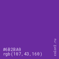 Цвет #6B2BA0 в цветовой модели RGB обозначается тремя октетами (107, 43, 160) в десятичном формате и #6B2BA0 в шестнадцатиричном (hex) формате, которые являются интенсивностью красного 107 (hex 6B), интенсивность зелёного 43 (hex 2B) и интенсивность синего 160 (hex A0).