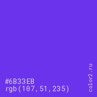 Цвет #6B33EB в цветовой модели RGB обозначается тремя октетами (107, 51, 235) в десятичном формате и #6B33EB в шестнадцатиричном (hex) формате, которые являются интенсивностью красного 107 (hex 6B), интенсивность зелёного 51 (hex 33) и интенсивность синего 235 (hex EB).