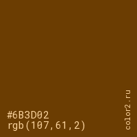 Цвет #6B3D02 в цветовой модели RGB обозначается тремя октетами (107, 61, 2) в десятичном формате и #6B3D02 в шестнадцатиричном (hex) формате, которые являются интенсивностью красного 107 (hex 6B), интенсивность зелёного 61 (hex 3D) и интенсивность синего 2 (hex 02).