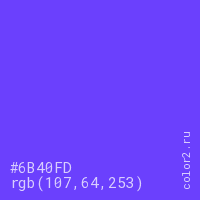 Цвет #6B40FD в цветовой модели RGB обозначается тремя октетами (107, 64, 253) в десятичном формате и #6B40FD в шестнадцатиричном (hex) формате, которые являются интенсивностью красного 107 (hex 6B), интенсивность зелёного 64 (hex 40) и интенсивность синего 253 (hex FD).