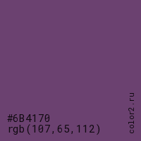 Цвет #6B4170 в цветовой модели RGB обозначается тремя октетами (107, 65, 112) в десятичном формате и #6B4170 в шестнадцатиричном (hex) формате, которые являются интенсивностью красного 107 (hex 6B), интенсивность зелёного 65 (hex 41) и интенсивность синего 112 (hex 70).
