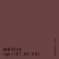 Цвет #6B4244 в цветовой модели RGB обозначается тремя октетами (107, 66, 68) в десятичном формате и #6B4244 в шестнадцатиричном (hex) формате, которые являются интенсивностью красного 107 (hex 6B), интенсивность зелёного 66 (hex 42) и интенсивность синего 68 (hex 44).