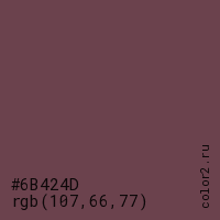 Цвет #6B424D в цветовой модели RGB обозначается тремя октетами (107, 66, 77) в десятичном формате и #6B424D в шестнадцатиричном (hex) формате, которые являются интенсивностью красного 107 (hex 6B), интенсивность зелёного 66 (hex 42) и интенсивность синего 77 (hex 4D).
