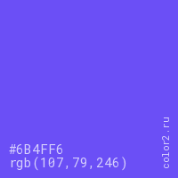 Цвет #6B4FF6 в цветовой модели RGB обозначается тремя октетами (107, 79, 246) в десятичном формате и #6B4FF6 в шестнадцатиричном (hex) формате, которые являются интенсивностью красного 107 (hex 6B), интенсивность зелёного 79 (hex 4F) и интенсивность синего 246 (hex F6).