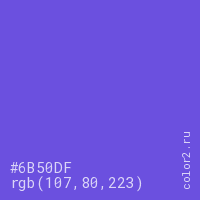 Цвет #6B50DF в цветовой модели RGB обозначается тремя октетами (107, 80, 223) в десятичном формате и #6B50DF в шестнадцатиричном (hex) формате, которые являются интенсивностью красного 107 (hex 6B), интенсивность зелёного 80 (hex 50) и интенсивность синего 223 (hex DF).