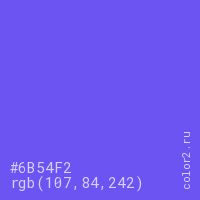 Цвет #6B54F2 в цветовой модели RGB обозначается тремя октетами (107, 84, 242) в десятичном формате и #6B54F2 в шестнадцатиричном (hex) формате, которые являются интенсивностью красного 107 (hex 6B), интенсивность зелёного 84 (hex 54) и интенсивность синего 242 (hex F2).