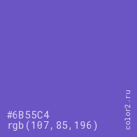 Цвет #6B55C4 в цветовой модели RGB обозначается тремя октетами (107, 85, 196) в десятичном формате и #6B55C4 в шестнадцатиричном (hex) формате, которые являются интенсивностью красного 107 (hex 6B), интенсивность зелёного 85 (hex 55) и интенсивность синего 196 (hex C4).