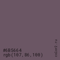 Цвет #6B5664 в цветовой модели RGB обозначается тремя октетами (107, 86, 100) в десятичном формате и #6B5664 в шестнадцатиричном (hex) формате, которые являются интенсивностью красного 107 (hex 6B), интенсивность зелёного 86 (hex 56) и интенсивность синего 100 (hex 64).