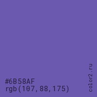 Цвет #6B58AF в цветовой модели RGB обозначается тремя октетами (107, 88, 175) в десятичном формате и #6B58AF в шестнадцатиричном (hex) формате, которые являются интенсивностью красного 107 (hex 6B), интенсивность зелёного 88 (hex 58) и интенсивность синего 175 (hex AF).