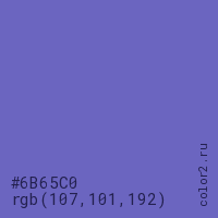 Цвет #6B65C0 в цветовой модели RGB обозначается тремя октетами (107, 101, 192) в десятичном формате и #6B65C0 в шестнадцатиричном (hex) формате, которые являются интенсивностью красного 107 (hex 6B), интенсивность зелёного 101 (hex 65) и интенсивность синего 192 (hex C0).