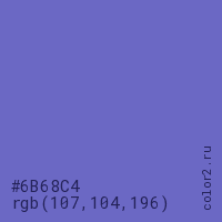 Цвет #6B68C4 в цветовой модели RGB обозначается тремя октетами (107, 104, 196) в десятичном формате и #6B68C4 в шестнадцатиричном (hex) формате, которые являются интенсивностью красного 107 (hex 6B), интенсивность зелёного 104 (hex 68) и интенсивность синего 196 (hex C4).