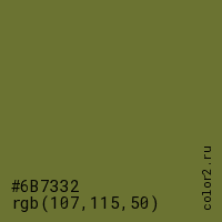 Цвет #6B7332 в цветовой модели RGB обозначается тремя октетами (107, 115, 50) в десятичном формате и #6B7332 в шестнадцатиричном (hex) формате, которые являются интенсивностью красного 107 (hex 6B), интенсивность зелёного 115 (hex 73) и интенсивность синего 50 (hex 32).