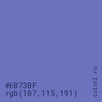 Цвет #6B73BF в цветовой модели RGB обозначается тремя октетами (107, 115, 191) в десятичном формате и #6B73BF в шестнадцатиричном (hex) формате, которые являются интенсивностью красного 107 (hex 6B), интенсивность зелёного 115 (hex 73) и интенсивность синего 191 (hex BF).