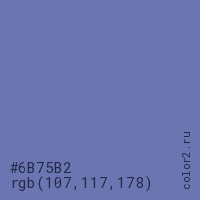 Цвет #6B75B2 в цветовой модели RGB обозначается тремя октетами (107, 117, 178) в десятичном формате и #6B75B2 в шестнадцатиричном (hex) формате, которые являются интенсивностью красного 107 (hex 6B), интенсивность зелёного 117 (hex 75) и интенсивность синего 178 (hex B2).