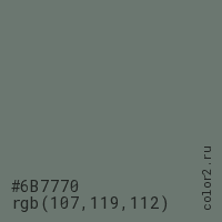 Цвет #6B7770 в цветовой модели RGB обозначается тремя октетами (107, 119, 112) в десятичном формате и #6B7770 в шестнадцатиричном (hex) формате, которые являются интенсивностью красного 107 (hex 6B), интенсивность зелёного 119 (hex 77) и интенсивность синего 112 (hex 70).