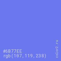 Цвет #6B77EE в цветовой модели RGB обозначается тремя октетами (107, 119, 238) в десятичном формате и #6B77EE в шестнадцатиричном (hex) формате, которые являются интенсивностью красного 107 (hex 6B), интенсивность зелёного 119 (hex 77) и интенсивность синего 238 (hex EE).