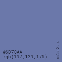 Цвет #6B78AA в цветовой модели RGB обозначается тремя октетами (107, 120, 170) в десятичном формате и #6B78AA в шестнадцатиричном (hex) формате, которые являются интенсивностью красного 107 (hex 6B), интенсивность зелёного 120 (hex 78) и интенсивность синего 170 (hex AA).