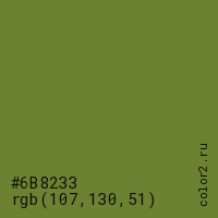 Цвет #6B8233 в цветовой модели RGB обозначается тремя октетами (107, 130, 51) в десятичном формате и #6B8233 в шестнадцатиричном (hex) формате, которые являются интенсивностью красного 107 (hex 6B), интенсивность зелёного 130 (hex 82) и интенсивность синего 51 (hex 33).