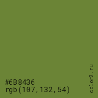 Цвет #6B8436 в цветовой модели RGB обозначается тремя октетами (107, 132, 54) в десятичном формате и #6B8436 в шестнадцатиричном (hex) формате, которые являются интенсивностью красного 107 (hex 6B), интенсивность зелёного 132 (hex 84) и интенсивность синего 54 (hex 36).
