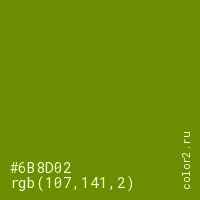 Цвет #6B8D02 в цветовой модели RGB обозначается тремя октетами (107, 141, 2) в десятичном формате и #6B8D02 в шестнадцатиричном (hex) формате, которые являются интенсивностью красного 107 (hex 6B), интенсивность зелёного 141 (hex 8D) и интенсивность синего 2 (hex 02).