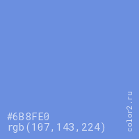 Цвет #6B8FE0 в цветовой модели RGB обозначается тремя октетами (107, 143, 224) в десятичном формате и #6B8FE0 в шестнадцатиричном (hex) формате, которые являются интенсивностью красного 107 (hex 6B), интенсивность зелёного 143 (hex 8F) и интенсивность синего 224 (hex E0).