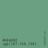 Цвет #6BA082 в цветовой модели RGB обозначается тремя октетами (107, 160, 130) в десятичном формате и #6BA082 в шестнадцатиричном (hex) формате, которые являются интенсивностью красного 107 (hex 6B), интенсивность зелёного 160 (hex A0) и интенсивность синего 130 (hex 82).