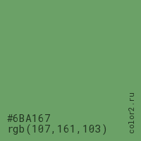 Цвет #6BA167 в цветовой модели RGB обозначается тремя октетами (107, 161, 103) в десятичном формате и #6BA167 в шестнадцатиричном (hex) формате, которые являются интенсивностью красного 107 (hex 6B), интенсивность зелёного 161 (hex A1) и интенсивность синего 103 (hex 67).