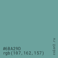 Цвет #6BA29D в цветовой модели RGB обозначается тремя октетами (107, 162, 157) в десятичном формате и #6BA29D в шестнадцатиричном (hex) формате, которые являются интенсивностью красного 107 (hex 6B), интенсивность зелёного 162 (hex A2) и интенсивность синего 157 (hex 9D).