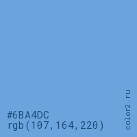 Цвет #6BA4DC в цветовой модели RGB обозначается тремя октетами (107, 164, 220) в десятичном формате и #6BA4DC в шестнадцатиричном (hex) формате, которые являются интенсивностью красного 107 (hex 6B), интенсивность зелёного 164 (hex A4) и интенсивность синего 220 (hex DC).