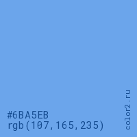 Цвет #6BA5EB в цветовой модели RGB обозначается тремя октетами (107, 165, 235) в десятичном формате и #6BA5EB в шестнадцатиричном (hex) формате, которые являются интенсивностью красного 107 (hex 6B), интенсивность зелёного 165 (hex A5) и интенсивность синего 235 (hex EB).