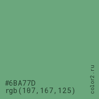 Цвет #6BA77D в цветовой модели RGB обозначается тремя октетами (107, 167, 125) в десятичном формате и #6BA77D в шестнадцатиричном (hex) формате, которые являются интенсивностью красного 107 (hex 6B), интенсивность зелёного 167 (hex A7) и интенсивность синего 125 (hex 7D).