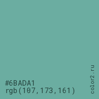 Цвет #6BADA1 в цветовой модели RGB обозначается тремя октетами (107, 173, 161) в десятичном формате и #6BADA1 в шестнадцатиричном (hex) формате, которые являются интенсивностью красного 107 (hex 6B), интенсивность зелёного 173 (hex AD) и интенсивность синего 161 (hex A1).