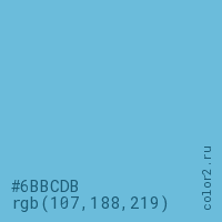 Цвет #6BBCDB в цветовой модели RGB обозначается тремя октетами (107, 188, 219) в десятичном формате и #6BBCDB в шестнадцатиричном (hex) формате, которые являются интенсивностью красного 107 (hex 6B), интенсивность зелёного 188 (hex BC) и интенсивность синего 219 (hex DB).