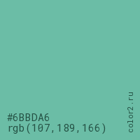 Цвет #6BBDA6 в цветовой модели RGB обозначается тремя октетами (107, 189, 166) в десятичном формате и #6BBDA6 в шестнадцатиричном (hex) формате, которые являются интенсивностью красного 107 (hex 6B), интенсивность зелёного 189 (hex BD) и интенсивность синего 166 (hex A6).