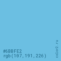 Цвет #6BBFE2 в цветовой модели RGB обозначается тремя октетами (107, 191, 226) в десятичном формате и #6BBFE2 в шестнадцатиричном (hex) формате, которые являются интенсивностью красного 107 (hex 6B), интенсивность зелёного 191 (hex BF) и интенсивность синего 226 (hex E2).