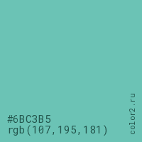 Цвет #6BC3B5 в цветовой модели RGB обозначается тремя октетами (107, 195, 181) в десятичном формате и #6BC3B5 в шестнадцатиричном (hex) формате, которые являются интенсивностью красного 107 (hex 6B), интенсивность зелёного 195 (hex C3) и интенсивность синего 181 (hex B5).
