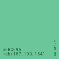 Цвет #6BC69A в цветовой модели RGB обозначается тремя октетами (107, 198, 154) в десятичном формате и #6BC69A в шестнадцатиричном (hex) формате, которые являются интенсивностью красного 107 (hex 6B), интенсивность зелёного 198 (hex C6) и интенсивность синего 154 (hex 9A).