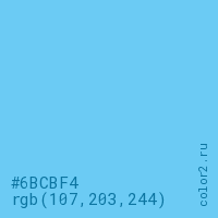 Цвет #6BCBF4 в цветовой модели RGB обозначается тремя октетами (107, 203, 244) в десятичном формате и #6BCBF4 в шестнадцатиричном (hex) формате, которые являются интенсивностью красного 107 (hex 6B), интенсивность зелёного 203 (hex CB) и интенсивность синего 244 (hex F4).