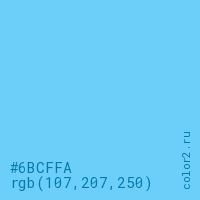 Цвет #6BCFFA в цветовой модели RGB обозначается тремя октетами (107, 207, 250) в десятичном формате и #6BCFFA в шестнадцатиричном (hex) формате, которые являются интенсивностью красного 107 (hex 6B), интенсивность зелёного 207 (hex CF) и интенсивность синего 250 (hex FA).