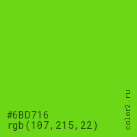 Цвет #6BD716 в цветовой модели RGB обозначается тремя октетами (107, 215, 22) в десятичном формате и #6BD716 в шестнадцатиричном (hex) формате, которые являются интенсивностью красного 107 (hex 6B), интенсивность зелёного 215 (hex D7) и интенсивность синего 22 (hex 16).