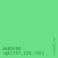 Цвет #6BDF88 в цветовой модели RGB обозначается тремя октетами (107, 223, 136) в десятичном формате и #6BDF88 в шестнадцатиричном (hex) формате, которые являются интенсивностью красного 107 (hex 6B), интенсивность зелёного 223 (hex DF) и интенсивность синего 136 (hex 88).