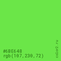 Цвет #6BE648 в цветовой модели RGB обозначается тремя октетами (107, 230, 72) в десятичном формате и #6BE648 в шестнадцатиричном (hex) формате, которые являются интенсивностью красного 107 (hex 6B), интенсивность зелёного 230 (hex E6) и интенсивность синего 72 (hex 48).