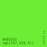 Цвет #6BEE33 в цветовой модели RGB обозначается тремя октетами (107, 238, 51) в десятичном формате и #6BEE33 в шестнадцатиричном (hex) формате, которые являются интенсивностью красного 107 (hex 6B), интенсивность зелёного 238 (hex EE) и интенсивность синего 51 (hex 33).