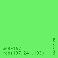Цвет #6BF167 в цветовой модели RGB обозначается тремя октетами (107, 241, 103) в десятичном формате и #6BF167 в шестнадцатиричном (hex) формате, которые являются интенсивностью красного 107 (hex 6B), интенсивность зелёного 241 (hex F1) и интенсивность синего 103 (hex 67).